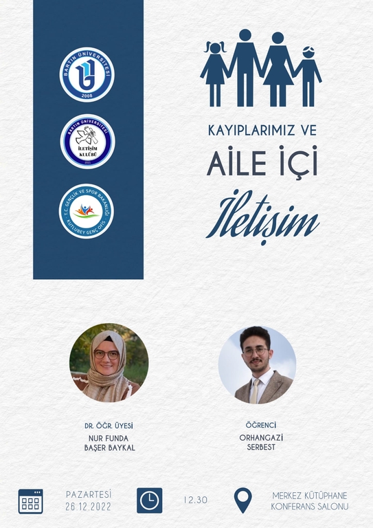 Bartın Üniversitesi, Bartın Üniversitesi İletişim Kulübü ve T.C. Gençlik ve Spor Bakanlığı Kutlubey Genç Ofis öncülüğünde bölümümüz Dr. Öğr. Üyesi Nur Funda BAŞER BAYKAL tarafından Pazartesi günü (26.12.2022) saat 12.30'da Merkez Kütüphane Konferans Salonu'nda "Kayıplarımız ve Aile İçi İletişim" başlıklı bir etkinlik düzenlenecektir.