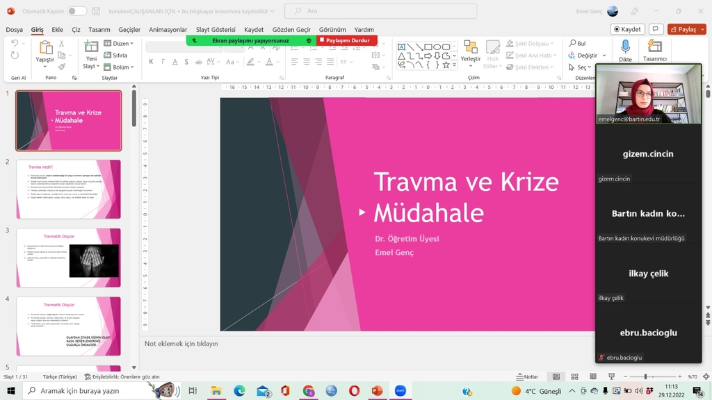 Bölümümüz Dr. Öğretim Üyesi Emel Genç tarafından Bartın Kadın Konukevi Müdürlüğü Çalışanlarına Yönelik Travma ve Krize Müdahale Eğitimi Düzenlendi.